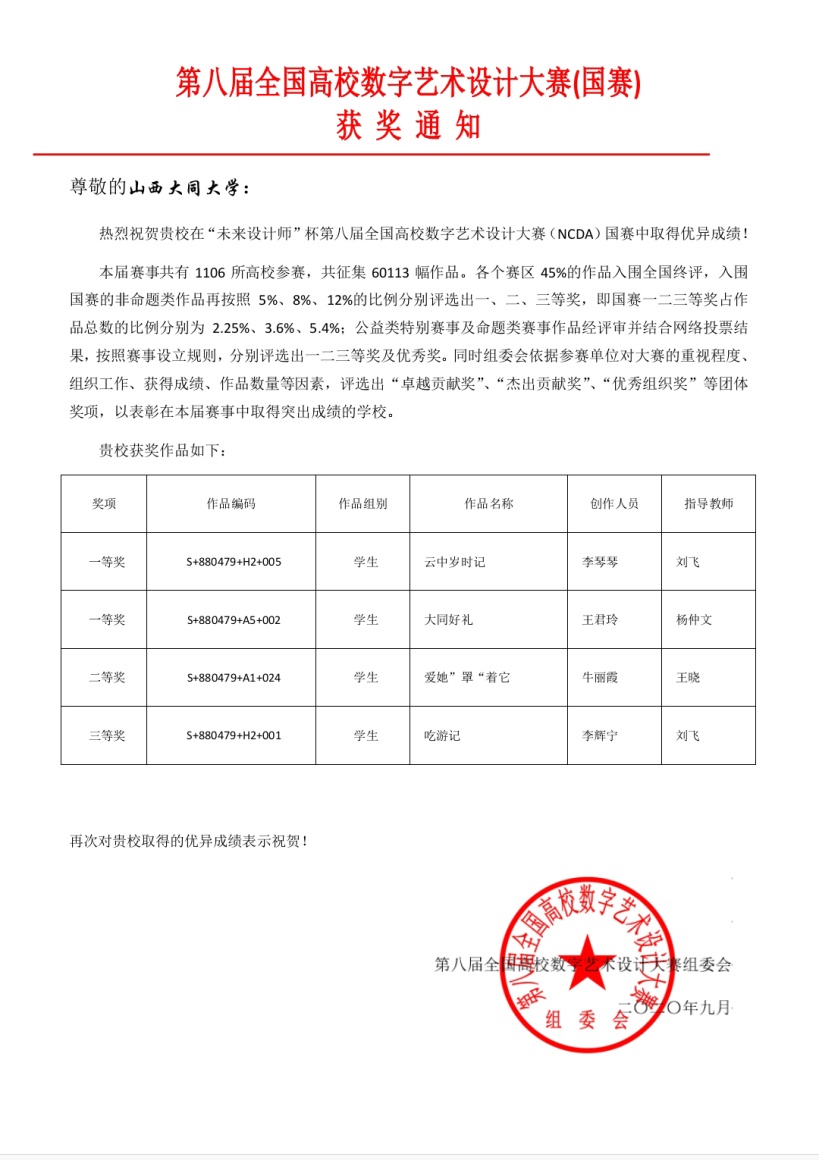其中,由刘飞老师指导,学生李琴琴设计的作品《云中岁时记》获全国一等奖,学生李辉宁设计作品《吃游记》获全国三等奖;杨仲文老师指导,学生王君玲设计作品《大同好礼》获全国一等奖;王晓老师指导,学生牛丽霞设计作品《爱她“罩”着她》获全国二等奖。刘飞、杨仲文、王晓三位老师获得相应等级的全国优秀指导教师奖。