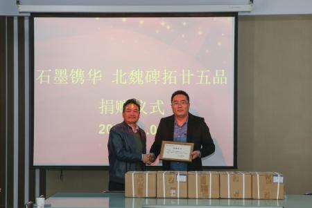 捐赠人齐晨霖先生将由他父亲齐开国先生主编的《石墨镌华—北魏碑拓廿五品》十套捐赠给大同大学美术学院。魏碑书体是中国书法演变过程中由汉隶向唐楷的过渡阶段,具有里程碑意义。大同作为北魏前期都城,是魏碑的发祥地。这部碑拓作品集是将北魏都城大同、洛阳二地魏碑精华汇集于一炉,由商务印刷馆出版。拓片字迹清晰,线条饱满,浑厚华滋,一派天然,有很高的艺术价值和收藏价值。