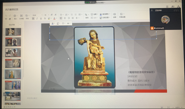 本次讲座以线上腾讯会议的形式进行。讲座从雕塑的源头谈起,通过赏析古希腊、古罗马、文艺复兴及以后诸流派雕塑代表作,全面呈现了西方雕塑艺大术从古代到近代的发展脉络。本次讲座通过PPT让与会者直面雕塑作品本身,在对大量具体作品的欣赏、解读、分析、比较中让讲座的观点自然呈现。最后任凡凡老师借用中国《旧唐书.魏征传》里的一句话作为总结:“以史为镜,可以知兴替。”我们今天之所以讲雕塑史不仅仅是为了回顾西方的雕塑史,更主要是要在了解过去的基础上,对比中西雕塑艺术发展,从而来思考我们怎么能够更好的向前发展,更好的传承与弘扬中华传统文化与中华美学精神。艺术创作唯有与国家、时代、人民相结合,才能展现出更旺盛的生命力。