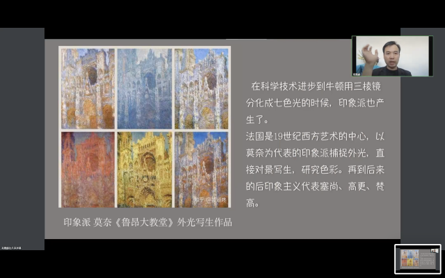 本次讲座以线上腾讯会议的形式进行。高霄鹏老师从艺术的概念及起源讲起,对不同历史时期的绘画艺术从东、西方两个不同的维度进行对比分析。通过对西方和中国艺术家的数百幅艺术作品进行深入讲解和剖析,阐释不同时期不同艺术家的不同创作观,教会大家如何用心创作作品,如何用心欣赏艺术作品,如何艺术化的生活。引导广大师生解开了艺术何为的谜团。讲座最后,高霄鹏老师还就听众提出来的问题在云端进行深入交流解答和互动。