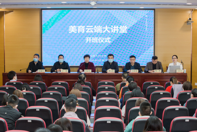 美育教育是立德树人的重要载体。围绕疫情防控状态下的师生美育主题,我院与教务部共同开展了面向全校的美育云端大讲堂系列活动。2022年3月30日,特邀大同大学美术学院副教授、云冈石窟美术研究所所长杨俊芳老师作《文化大同 世界云冈》的主题讲座。作为大同大学“美育云端大讲堂”系列讲座的首讲,深受广大师生欢迎。讲座开始前,举行了开班仪式,校党委副书记、校长姚丽英,校党委常委、副校长翟大彤,校党委常委、宣传部长孙刚等学校和学院有关领导出席了开班仪式。
