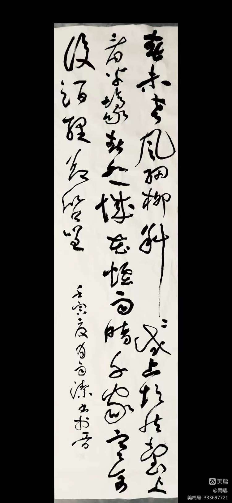我的作品为草书六尺条幅创作,内容为清代慧霖的《闰中秋玩月》,全文42个字,整幅作品高180厘米,宽45厘米。霖公于闰八月中秋之夜赏月,写下这首有名的赏月诗。诗写了客边之愁,满月之光,菊花之艳,桂子之香。一个百年难遇的闰中秋,被霖公写得有声有色,多姿多彩。作品以黄庭坚草书为主要取法对象,结合其他书家的草书风格样貌,融合贯通而不拘泥于一家。作品气势雄伟、大气磅礴,笔意纵横恣肆、无拘无束而又不失古法。点画灵动活泼、变化多端;线条动感十足、饱满圆厚,点、线、面的结合营造出丰富的空间视觉效果。