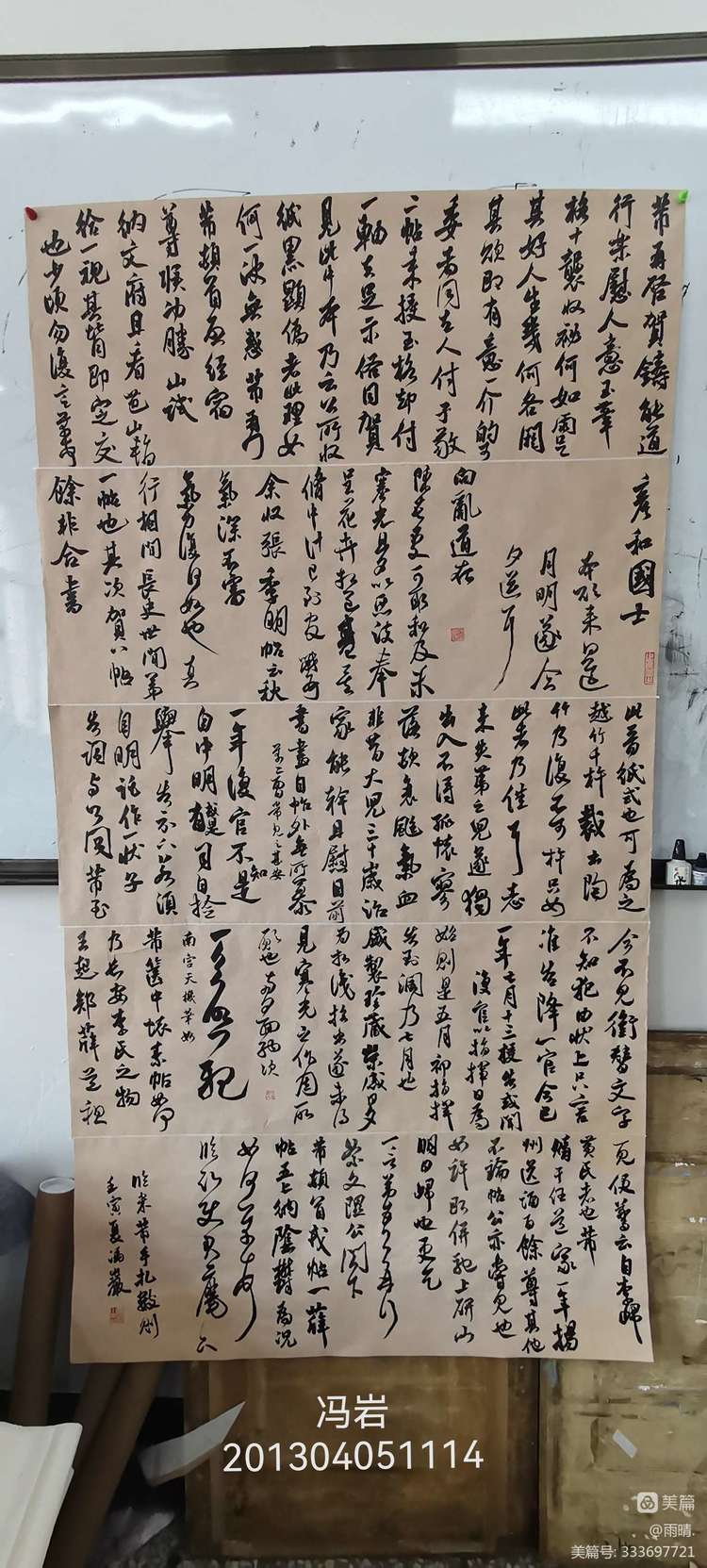 我的结课作品为小六尺的行书作品,内容为古代诗歌六首,用纸为元书纸,由8小幅拼接而成,整幅作品的面貌是以米芾的行书风格为基准,多以米芾行书蜀素帖为主要取法对象。整幅作品章法布局统一协调,强调了墨色变化,结字上注重欹侧取势、大小参差错落有致,其间夹杂一些组合用来调节节奏,给人一种连绵感和质朴感富有变化。注重用笔,掌握基本笔法。落款书体与正文一致,书写一列,并钤盖有自制印章一方,使作品整体上达到了和谐统一。