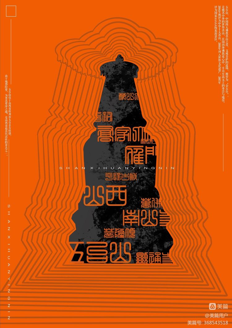 创作理念:以五台山的剪影为主体,线描的形式,采用重复,给人一种俯视的视觉感,剪影里使用了山西一些特色景点的文字,以为让人透过五台山看山西,整体色调采用了富有活力的橙色,让大众了解一个更加有活力的山西。