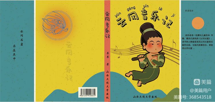 创作理念:该作品以云冈石窟为主题,是一本历史插画类的书籍,主要围绕一些云冈石窟的插画,小卡通人物来制作,云岗人物形象和书籍封面封底颜色成对比,相呼应,然后用重色做护封,吸引读者眼球。